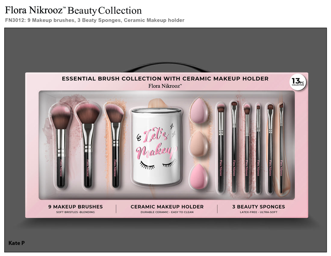 Flora Nikrooz™ Essential Brush Collection with Ceramic Makeup Holder This complete 13-piece set includes face...
