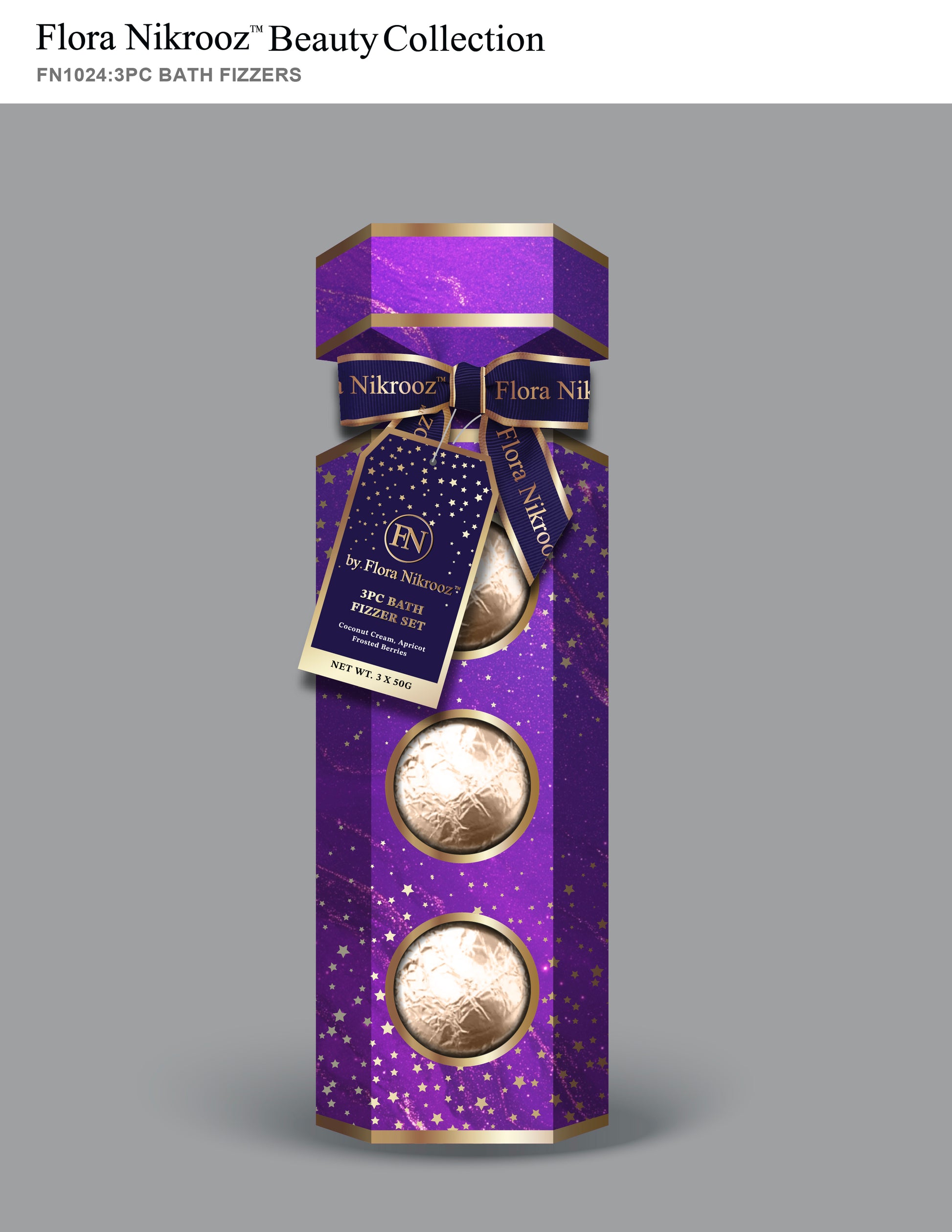 Indulge in a luxurious bath experience with this beautifully packaged bath fizzer set from the Flora Nikrooz Beauty Collection. Each 50 g fizzer gently fizzes in warm water, releasing soft fragrance in Coconut Cream, Apricot, and Frosted Berries for a relaxing, spa-like soak. Perfect for gifting or elevating everyday self-care with a touch of elegance. Imported